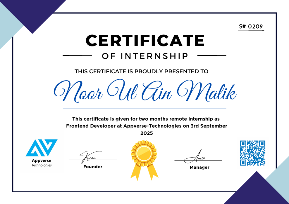 Completed internships at Appverse Technologies and Oradigitals, gaining experience in React.js, Tailwind CSS, API integration, MySQL optimization, and building scalable backend systems. Certified in Open Access Publishing, Robotics, and Academic Excellence.