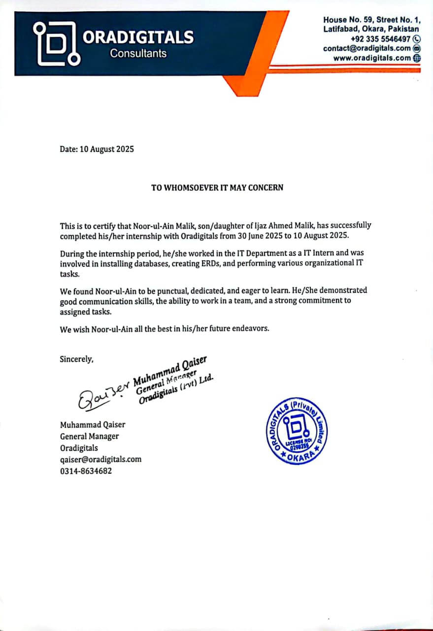 Visit Company WebsiteSuccessfully completed the internship. Designed and optimized MySQL databases, ERDs, and backend queries, improving query efficiency by 25%. Contributed to the OIMS by enhancing database performance, backend reliability, and business data integration. Gained hands-on experience in data analysis, problem-solving, and IT operational tasks.